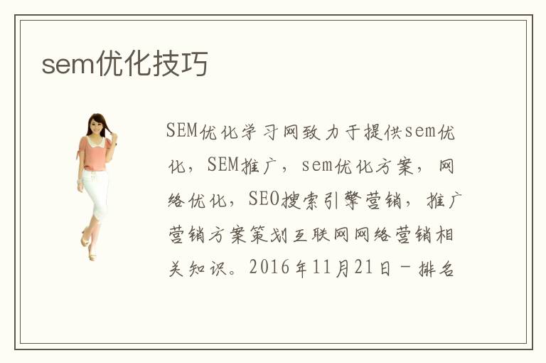 SEM優(yōu)化學(xué)習(xí)網(wǎng)致力于提供sem優(yōu)化,SEM推廣,sem優(yōu)化方案,網(wǎng)絡(luò)優(yōu)化,SEO搜索引擎營(yíng)銷,推廣營(yíng)銷方案策劃互聯(lián)網(wǎng)網(wǎng)絡(luò)營(yíng)銷相關(guān)知識(shí)。