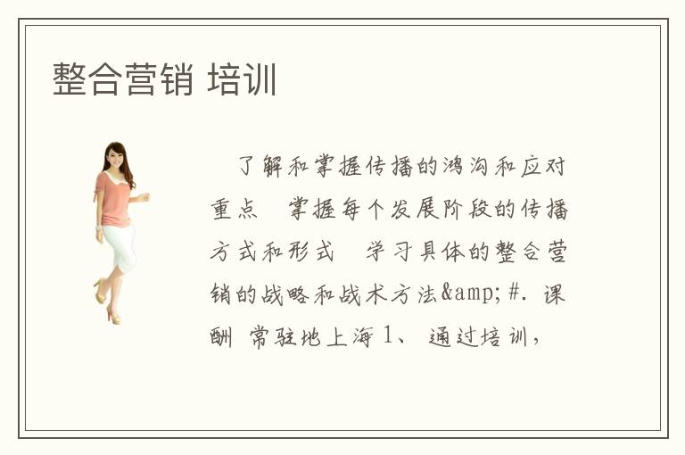 ?了解和掌握傳播的鴻溝和應(yīng)對(duì)重點(diǎn)?掌握每個(gè)發(fā)展階段的傳播方式和形式?學(xué)習(xí)具體的整合營銷的戰(zhàn)略和戰(zhàn)術(shù)方法&#. 課酬 常駐地上海 1、 通過培訓(xùn),使學(xué)員全面了