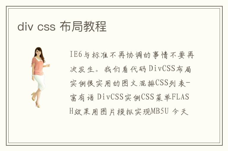 IE6與標(biāo)準(zhǔn)不再協(xié)調(diào)的事情不要再次發(fā)生。我們看代碼 DivCSS布局實(shí)例很實(shí)用的圖文混排CSS列表-富有語(yǔ) DivCSS實(shí)例CSS菜單FLASH效果用圖片模擬實(shí)現(xiàn)MB5U 今天有人