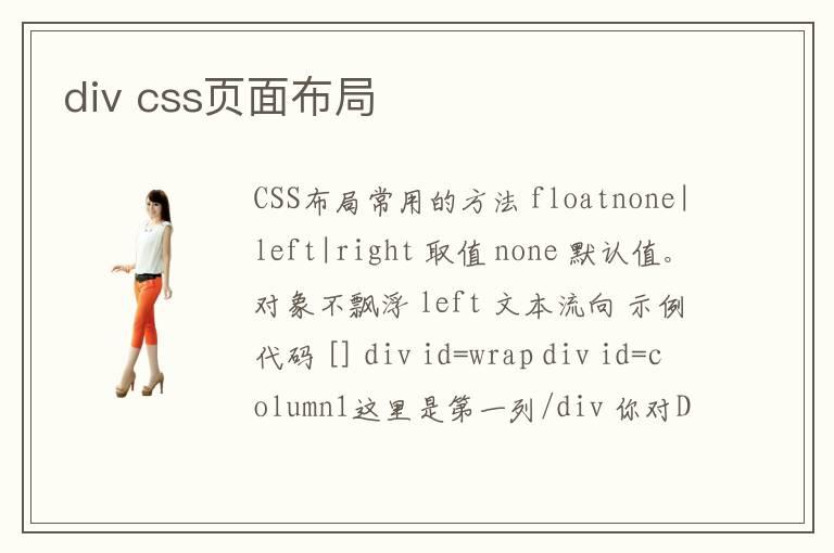 CSS布局常用的方法 floatnone|left|right 取值 none 默認(rèn)值。對(duì)象不飄浮 left 文本流向 示例代碼 [] <div id="wrap"> <div id="column1">這里是第一列</div>