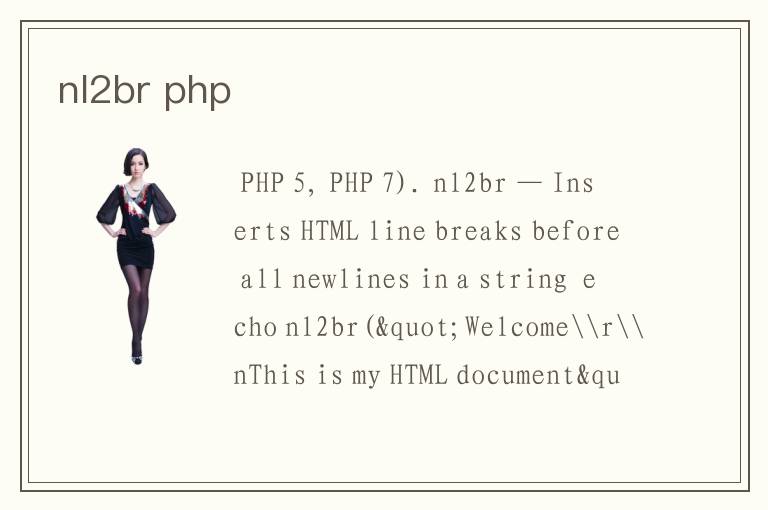 PHP 5, PHP 7). nl2br — Inserts HTML line breaks before all newlines in a string echo nl2br(\"Welcome\\r\\nThis is my HTML document\", false); ?> The above
