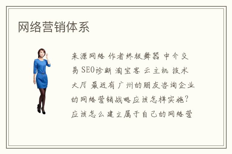 來源網(wǎng)絡(luò) 作者終極舞器 中介交易 SEO診斷 淘寶客 云主機(jī) 技術(shù)大廳 最近有廣州的朋友咨詢企業(yè)的網(wǎng)絡(luò)營銷戰(zhàn)略應(yīng)該怎樣實(shí)施?應(yīng)該怎么建立屬于自己的網(wǎng)絡(luò)營銷體系?那怎樣