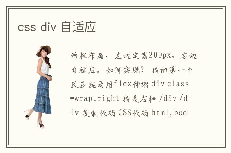 兩欄布局,左邊定寬200px,右邊自適應。如何實現(xiàn)? 我的第一個反應就是用flex伸縮 <div class="wrap_right"> 我是右欄 </div> </div> 復制代碼 CSS代碼 html,body,div{