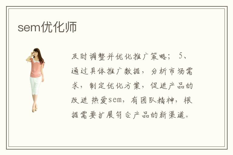 及時調(diào)整并優(yōu)化推廣策略; 5、通過具體推廣數(shù)據(jù),分析市場需求,制定優(yōu)化方案,促進(jìn)產(chǎn)品的改進(jìn) 熱愛sem,有團(tuán)隊精神,根據(jù)需要擴展符合產(chǎn)品的新渠道。 任職要求 1、有游