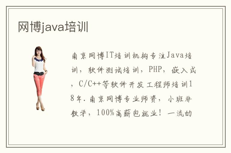 南京網(wǎng)博IT培訓(xùn)機(jī)構(gòu)專注Java培訓(xùn),軟件測試培訓(xùn),PHP,嵌入式,C/C++等軟件開發(fā)工程師培訓(xùn)18年.南京網(wǎng)博專業(yè)師資,小班非教學(xué),100%高薪包就業(yè)!一流的軟件編程開