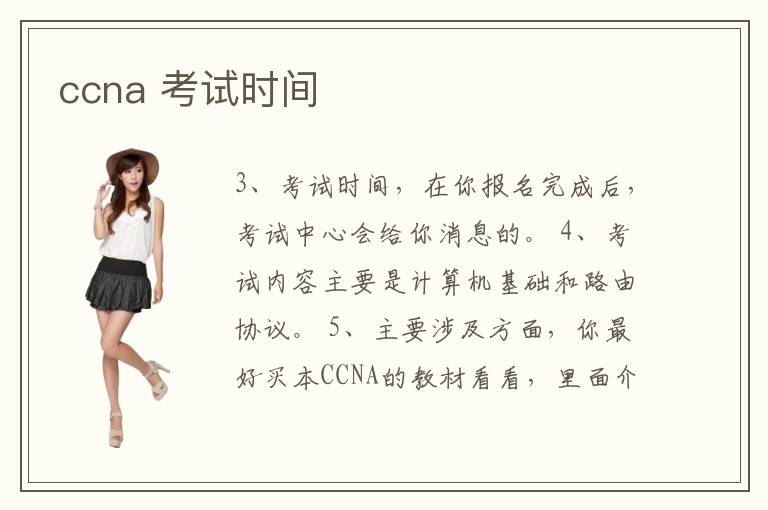 3、考試時間,在你報名完成后,考試中心會給你消息的。 4、考試內容主要是計算機基礎和路由協(xié)議。 5、主要涉及方面,你最好買本CCNA的教材看看,里面介紹的肯定比我說的