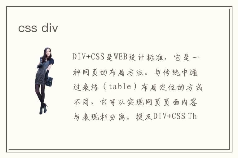 DIV+CSS是WEB設(shè)計(jì)標(biāo)準(zhǔn),它是一種網(wǎng)頁(yè)的布局方法。與傳統(tǒng)中通過(guò)表格(table)布局定位的方式不同,它可以實(shí)現(xiàn)網(wǎng)頁(yè)頁(yè)面內(nèi)容與表現(xiàn)相分離。提及DIV+CSS