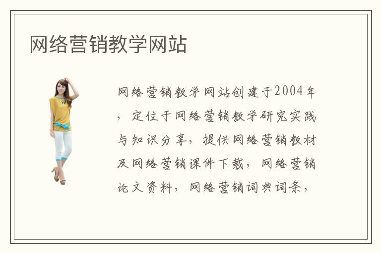 網(wǎng)絡(luò)營銷教學(xué)網(wǎng)站創(chuàng)建于2004年,定位于網(wǎng)絡(luò)營銷教學(xué)研究實(shí)踐與知識分享,提供網(wǎng)絡(luò)營銷教材及網(wǎng)絡(luò)營銷課件下載,網(wǎng)絡(luò)營銷論文資料,網(wǎng)絡(luò)營銷詞典詞條,大學(xué)生網(wǎng)絡(luò)營銷能力