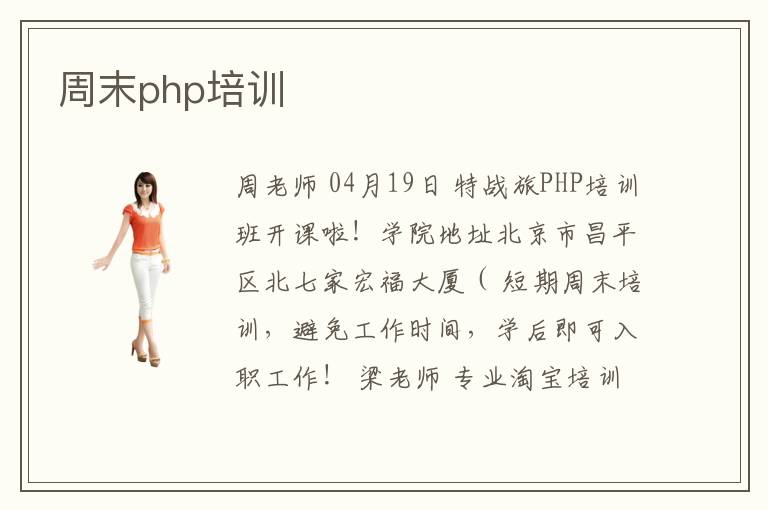 周老師 04月19日 特戰(zhàn)旅PHP培訓(xùn)班開課啦!學(xué)院地址北京市昌平區(qū)北七家宏福大廈( 短期周末培訓(xùn),避免工作時(shí)間,學(xué)后即可入職工作! 梁老師 專業(yè)淘寶培訓(xùn)-7年運(yùn)營經(jīng)驗(yàn)-1