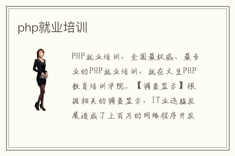 PHP就業(yè)培訓(xùn),全國最權(quán)威、最專業(yè)的PHP就業(yè)培訓(xùn),就在文豆PHP教育培訓(xùn)學(xué)院。【調(diào)查顯示】根據(jù)相關(guān)的調(diào)查顯示,IT業(yè)迅猛發(fā)展造成了上百萬的網(wǎng)絡(luò)程序開發(fā)、設(shè)計(jì)、建設(shè)、