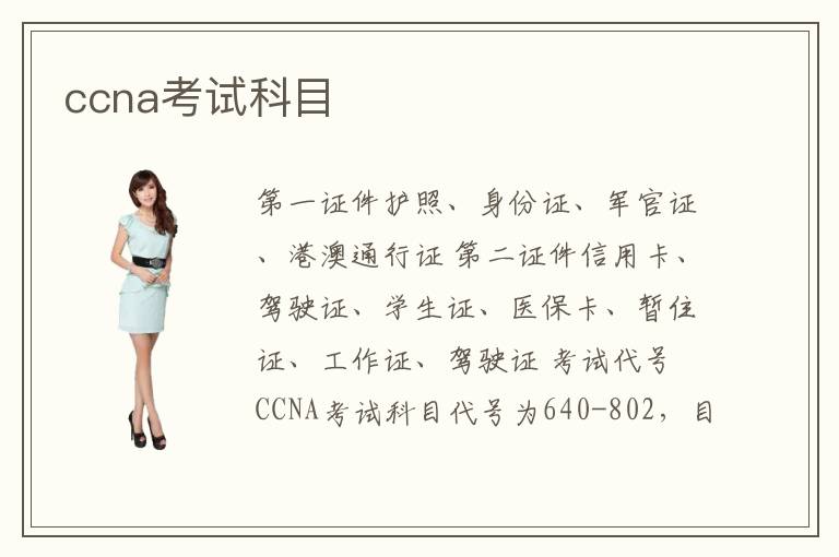 第一證件護照、身份證、軍官證、港澳通行證 第二證件信用卡、駕駛證、學生證、醫(yī)???、暫住證、工作證、駕駛證 考試代號 CCNA考試科目代號為640-802,目前CCNA考試