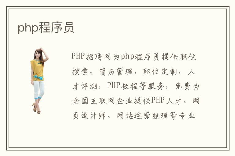 PHP招聘網(wǎng)為php程序員提供職位搜索,簡歷管理,職位定制,人才評測,PHP教程等服務(wù),免費為全國互聯(lián)網(wǎng)企業(yè)提供PHP人才、網(wǎng)頁設(shè)計師、網(wǎng)站運營經(jīng)理等專業(yè)人才,歡迎用