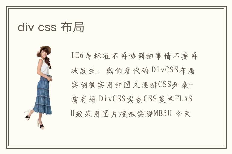 IE6與標(biāo)準(zhǔn)不再協(xié)調(diào)的事情不要再次發(fā)生。我們看代碼 DivCSS布局實(shí)例很實(shí)用的圖文混排CSS列表-富有語 DivCSS實(shí)例CSS菜單FLASH效果用圖片模擬實(shí)現(xiàn)MB5U 今天有人
