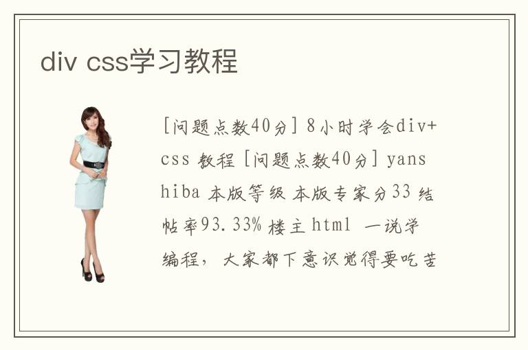 [問(wèn)題點(diǎn)數(shù)40分] 8小時(shí)學(xué)會(huì)div+css 教程 [問(wèn)題點(diǎn)數(shù)40分] yanshiba 本版等級(jí) 本版專(zhuān)家分33 結(jié)帖率93.33% 樓主 html 一說(shuō)學(xué)編程,大家都下意識(shí)覺(jué)得要"吃苦",
