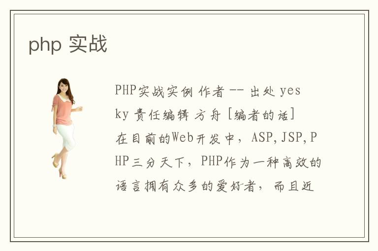 PHP實(shí)戰(zhàn)實(shí)例 作者 -- 出處 yesky 責(zé)任編輯 方舟 [編者的話] 在目前的Web開發(fā)中,ASP,JSP,PHP三分天下,PHP作為一種高效的語言擁有眾多的愛好者,而且近來越來越