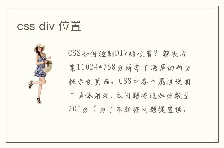 CSS如何控制DIV的位置?解決方案11024*768分辨率下滿(mǎn)屏的兩分欄示例頁(yè)面,CSS中各個(gè)屬性說(shuō)明下具體用處.本問(wèn)題將追加分?jǐn)?shù)至200分(為了不斷將問(wèn)題提置頂,結(jié)貼前補(bǔ)