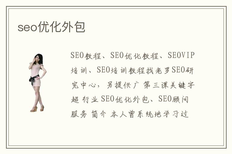 SEO教程、SEO優(yōu)化教程、SEOVIP培訓(xùn)、SEO培訓(xùn)教程找老羅SEO研究中心,另提供廣 第三課關(guān)鍵字超 行業(yè) SEO優(yōu)化外包、SEO顧問服務(wù) 簡介 本人曾系統(tǒng)地學(xué)習(xí)過