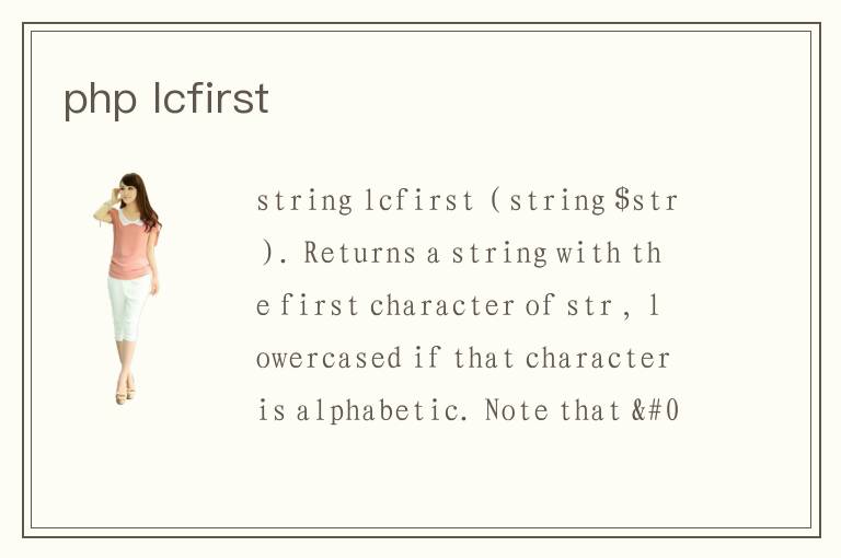 (PHP 5 >= 5.3.0) lcfirst — 使一個字符串的第一個字符小寫 說明 string lcfirst ( string $str ) 返回 str 的第一個字符小寫了的字符串。如果 str 的第一個字符是字母,則將其轉換為小寫。
