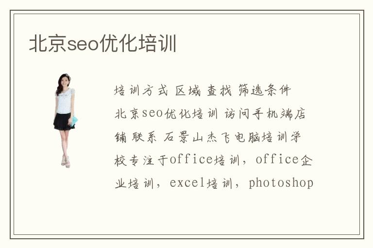培訓方式 區(qū)域 查找 篩選條件 北京seo優(yōu)化培訓 訪問手機端店鋪 聯(lián)系 石景山杰飛電腦培訓學校專注于office培訓,office企業(yè)培訓,excel培訓,photoshop培訓,平面