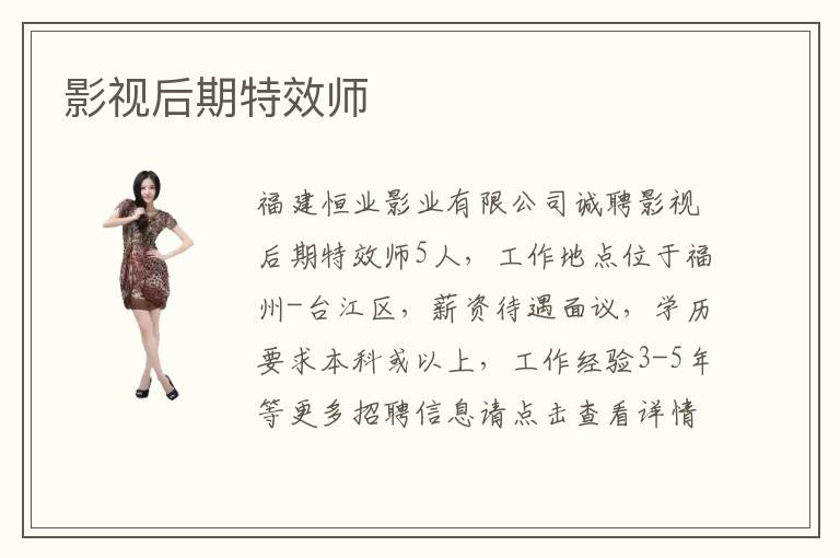 福建恒業(yè)影業(yè)有限公司誠聘影視后期特效師5人,工作地點位于福州-臺江區(qū),薪資待遇面議,學(xué)歷要求本科或以上,工作經(jīng)驗3-5年等更多招聘信息請點擊查看詳情【智聯(lián)招聘,為