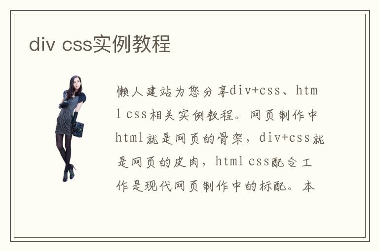 懶人建站為您分享div+css、html css相關實例教程。網(wǎng)頁制作中html就是網(wǎng)頁的骨架,div+css就是網(wǎng)頁的皮肉,html css配合工作是現(xiàn)代網(wǎng)頁制作中的標配。