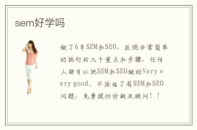 做了6年SEM和SEO,發(fā)現(xiàn)非常簡(jiǎn)單的執(zhí)行好幾個(gè)重點(diǎn)和步驟,任何人都可以把SEM和SEO做的Very very good。不廢話了有SEM和SEO問(wèn)題,免費(fèi)提供診斷及顧問(wèn)??!
