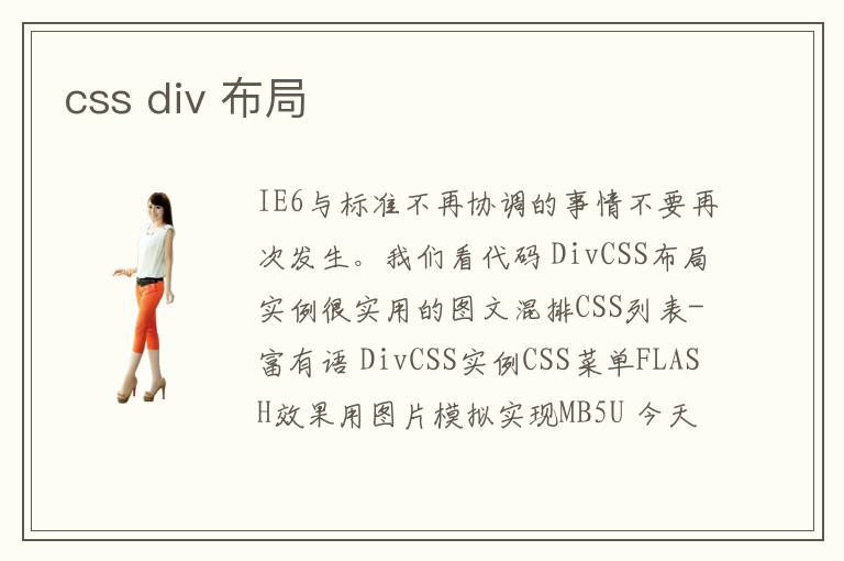 IE6與標(biāo)準(zhǔn)不再協(xié)調(diào)的事情不要再次發(fā)生。我們看代碼 DivCSS布局實(shí)例很實(shí)用的圖文混排CSS列表-富有語 DivCSS實(shí)例CSS菜單FLASH效果用圖片模擬實(shí)現(xiàn)MB5U 今天有人
