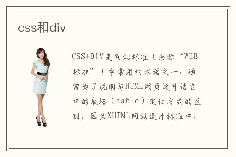 CSS+DIV是網(wǎng)站標準(或稱“WEB標準”)中常用的術(shù)語之一,通常為了說明與HTML網(wǎng)頁設(shè)計語言中的表格(table)定位方式的區(qū)別,因為XHTML網(wǎng)站設(shè)計標準中,不再使用表