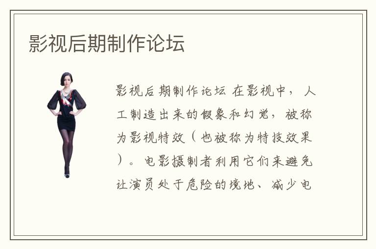 影視后期制作論壇 在影視中,人工制造出來的假象和幻覺,被稱為影視特效(也被稱為特技效果)。電影攝制者利用它們來避免讓演員處于危險(xiǎn)的境地、減少電影的制作成本,或者