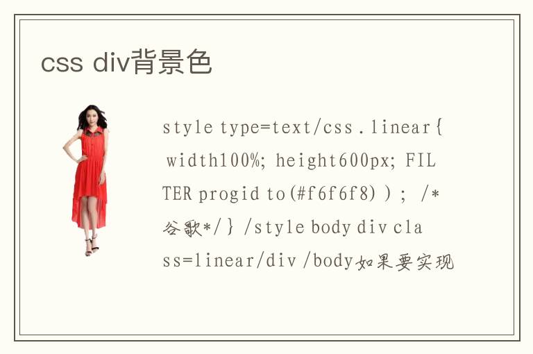 <style type="text/css"> .linear{ width100%; height600px; FILTER progid to(#f6f6f8));/*谷歌*/ } </style> <body> <div class="linear"></div> </body>
