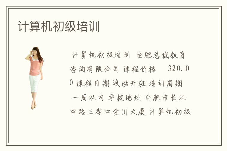 < 計(jì)算機(jī)初級(jí)培訓(xùn) > 合肥總裁教育咨詢有限公司 課程價(jià)格 ¥320.00 課程日期 滾動(dòng)開班 培訓(xùn)周期 一周以內(nèi) 學(xué)校地址 合肥市長江中路三孝口金川大廈 計(jì)算機(jī)初級(jí)培訓(xùn) 合肥辦公自動(dòng)