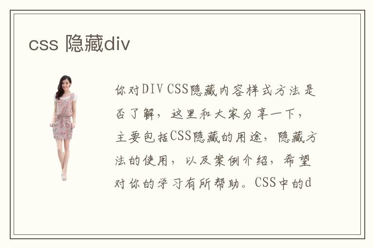 你對(duì)DIV CSS隱藏內(nèi)容樣式方法是否了解,這里和大家分享一下,主要包括CSS隱藏的用途,隱藏方法的使用,以及案例介紹,希望對(duì)你的學(xué)習(xí)有所幫助。