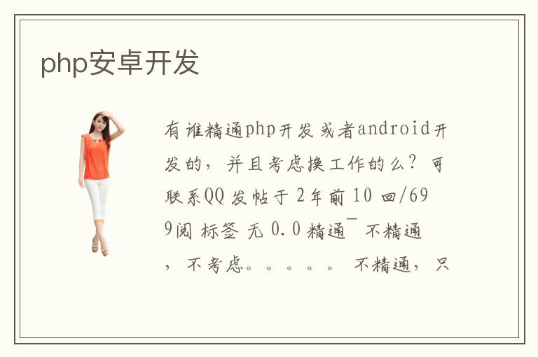 有誰(shuí)精通php開發(fā)或者android開發(fā)的,并且考慮換工作的么?可聯(lián)系QQ 發(fā)帖于 2年前 10 回/699閱 標(biāo)簽 <無(wú)> 0.0 精通~ 不精通,不考慮。。。。。 不精通,只熟悉