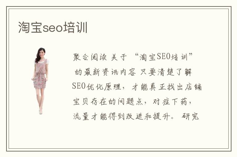 聚合閱讀 關(guān)于 “淘寶SEO培訓(xùn)” 的最新資訊內(nèi)容 只要清楚了解SEO優(yōu)化原理,才能真正找出店鋪寶貝存在的問(wèn)題點(diǎn),對(duì)癥下藥,流量才能得到改進(jìn)和提升。 研究搜索seo不是為