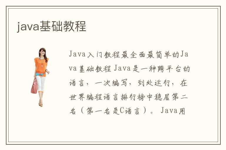 Java入門教程最全面最簡(jiǎn)單的Java基礎(chǔ)教程 Java是一種跨平臺(tái)的語(yǔ)言,一次編寫,到處運(yùn)行,在世界編程語(yǔ)言排行榜中穩(wěn)居第二名(第一名是C語(yǔ)言)。 Java用途廣泛,可以用來(lái)