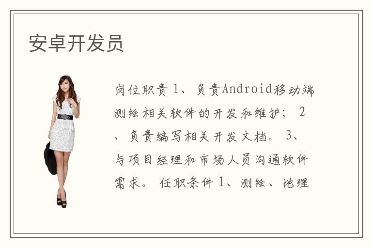 崗位職責(zé) 1、負(fù)責(zé)Android移動(dòng)端測(cè)繪相關(guān)軟件的開發(fā)和維護(hù); 2、負(fù)責(zé)編寫相關(guān)開發(fā)文檔。 3、與項(xiàng)目經(jīng)理和市場(chǎng)人員溝通軟件需求。 任職條件 1、測(cè)繪、地理信息系統(tǒng)等相關(guān)