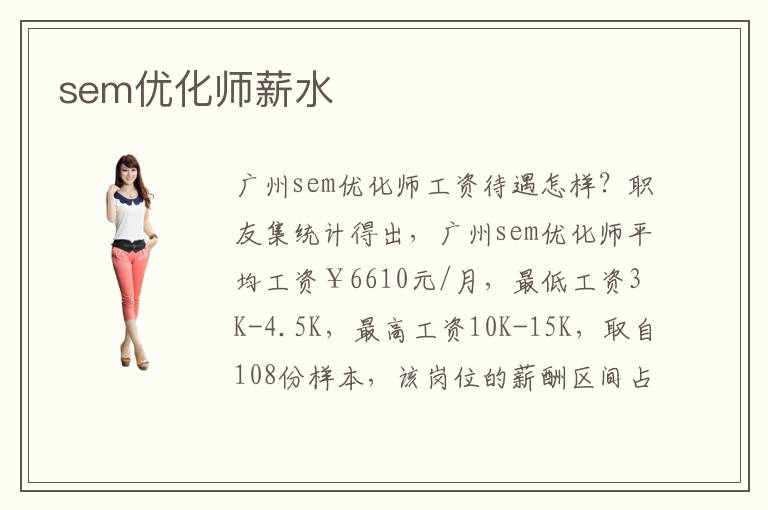廣州sem優(yōu)化師工資待遇怎樣?職友集統(tǒng)計得出,廣州sem優(yōu)化師平均工資¥6610元/月,最低工資3K-4.5K,最高工資10K-15K,取自108份樣本,該崗位的薪酬區(qū)間占比,工作經