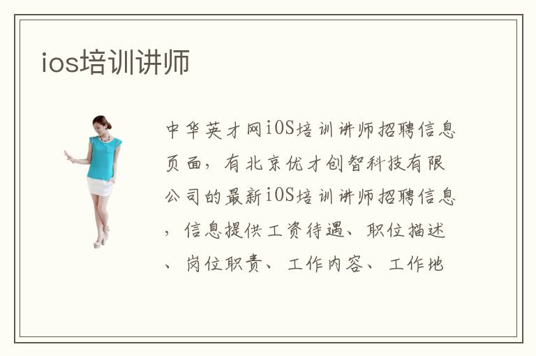 中華英才網iOS培訓講師招聘信息頁面,有北京優(yōu)才創(chuàng)智科技有限公司的最新iOS培訓講師招聘信息,信息提供工資待遇、職位描述、崗位職責、工作內容、工作地點、招聘人數(shù)、