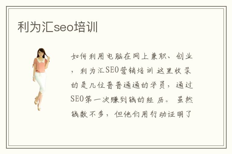 如何利用電腦在網(wǎng)上兼職、創(chuàng)業(yè),利為匯SEO營銷培訓 這里收錄的是幾位普普通通的學員,通過SEO第一次賺到錢的經(jīng) 歷。 雖然錢數(shù)不多,但他們用行動證明了這條路是走得通的