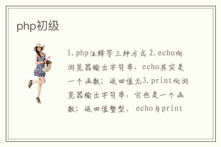 1.php注釋等三種方式 2.echo向瀏覽器輸出字符串,echo其實是一個函數(shù);返回值無3.print向瀏覽器輸出字符串,它也是一個函數(shù);返回值整型。 echo與print的功能幾乎