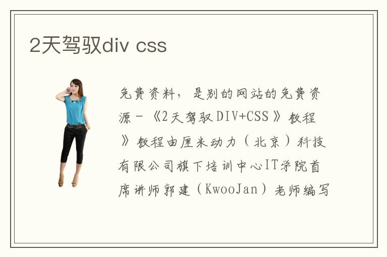 免費(fèi)資料,是別的網(wǎng)站的免費(fèi)資源 - 《2天駕馭 DIV+CSS 》教程 》教程由厘米動力(北京)科技有限公司旗下培訓(xùn)中心IT學(xué)院首席講師郭建(KwooJan)老師編寫.。轉(zhuǎn)載自 轉(zhuǎn)載
