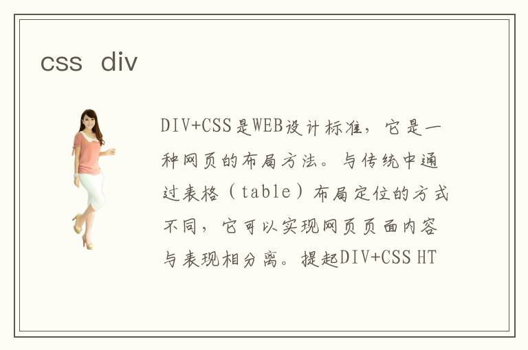 DIV+CSS是WEB設計標準,它是一種網頁的布局方法。與傳統(tǒng)中通過表格(table)布局定位的方式不同,它可以實現網頁頁面內容與表現相分離。提起DIV+CSS