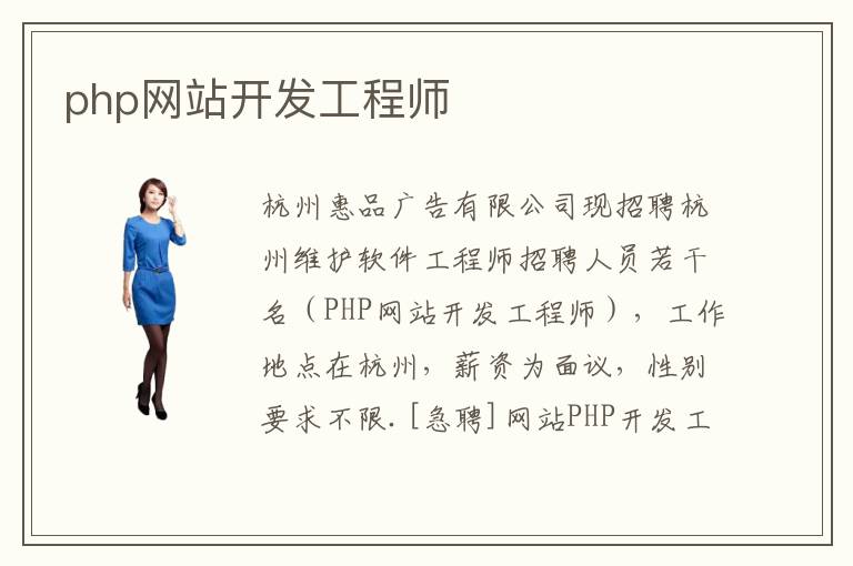 杭州惠品廣告有限公司現(xiàn)招聘杭州維護(hù)軟件工程師招聘人員若干名(PHP網(wǎng)站開(kāi)發(fā)工程師),工作地點(diǎn)在杭州,薪資為面議,性別要求不限.