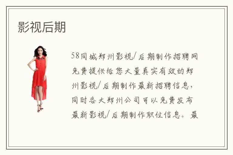 58同城鄭州影視/后期制作招聘網(wǎng)免費(fèi)提供給您大量真實(shí)有效的鄭州影視/后期制作最新招聘信息,同時(shí)各大鄭州公司可以免費(fèi)發(fā)布最新影視/后期制作職位信息。最好的鄭州影視/
