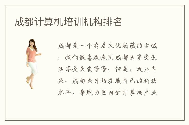 成都是一個(gè)有著文化底蘊(yùn)的古城,我們很喜歡來到成都去享受生活享受美食等等,但是,近幾年來,成都也開始發(fā)展自己的科技水平,爭(zhēng)取為國(guó)內(nèi)的計(jì)算機(jī)產(chǎn)業(yè)做出一些推動(dòng)作用。我們參考了成都計(jì)算機(jī)培訓(xùn)計(jì)算機(jī)培訓(xùn)機(jī)構(gòu)排名,這對(duì)我們篩選成都計(jì)算機(jī)培訓(xùn)中心有一些程度的幫助。成都地區(qū)電腦培訓(xùn)中心效果是值得我們期待的,因?yàn)橛?jì)算機(jī)成都計(jì)算機(jī)教育口碑一般是比較好的。