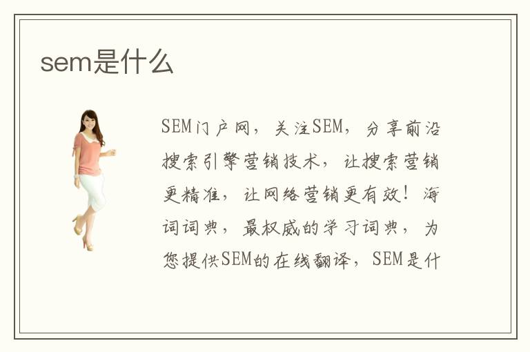 海詞詞典,最權(quán)威的學(xué)習(xí)詞典,為您提供SEM的在線翻譯,SEM是什么意思,SEM的真人發(fā)音,權(quán)威用法和精選例句等。