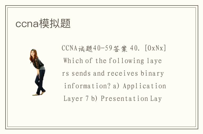 CCNA試題40-59答案 40. [OxNx] Which of the following layers sends and receives binary information? a) Application Layer 7 b) Presentation Layer 6 c) Session Layer 5