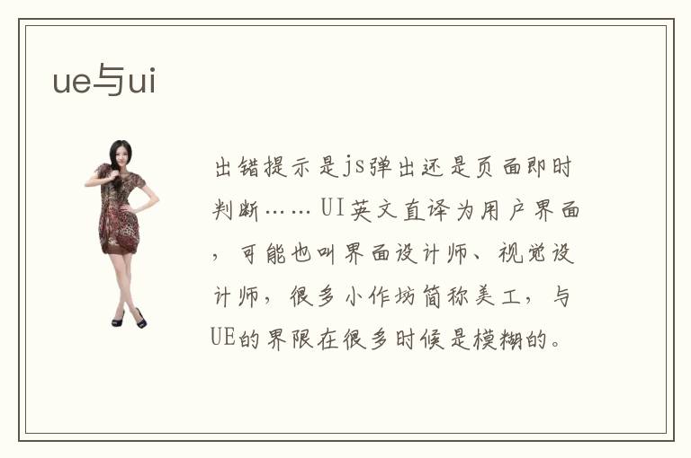 出錯提示是js彈出還是頁面即時判斷…… UI英文直譯為用戶界面,可能也叫界面設(shè)計師、視覺設(shè)計師,很多小作坊簡稱美工,與UE的界限在很多時候是模糊的。到了UI層面,基本