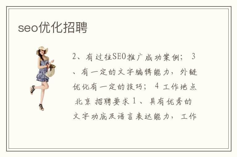2、有過(guò)往SEO推廣成功案例; 3、有一定的文字編輯能力,外鏈優(yōu)化有一定的技巧; 4 工作地點(diǎn) 北京 招聘要求 1 、具有優(yōu)秀的文字功底及語(yǔ)言表達(dá)能力,工作責(zé)任心強(qiáng),