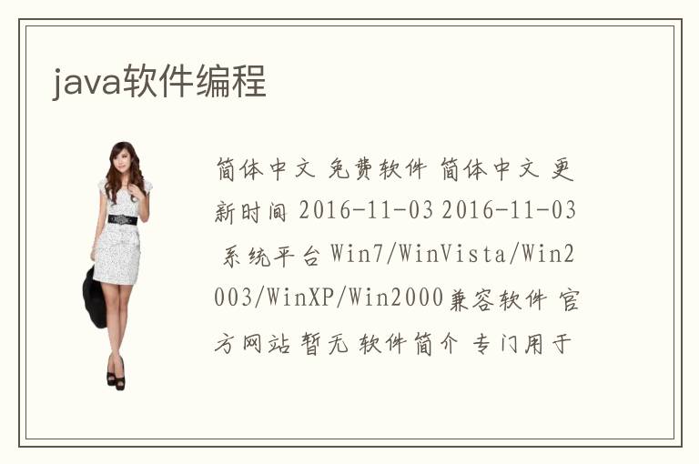簡(jiǎn)體中文 免費(fèi)軟件 簡(jiǎn)體中文 更新時(shí)間 2016-11-03 2016-11-03 系統(tǒng)平臺(tái) Win7/WinVista/Win2003/WinXP/Win2000兼容軟件 官方網(wǎng)站 暫無(wú) 軟件簡(jiǎn)介 專門用于學(xué)習(xí) Java 編程